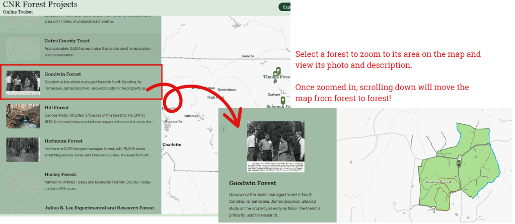 As a final component of the online application, I created a short StoryMap allowing users to “tour” each forest. After a brief introduction to the managed-forest program, users can select a forest to zoom to its location on the map, read a short description, and view a photo.