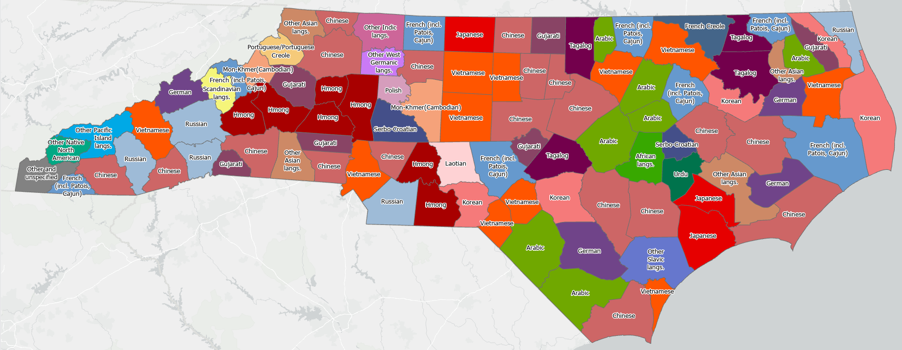 I endeavored to further characterize the nature of LEP populations within North Carolina by finding the most common language spoken aside from English (and Spanish, which is the second-most common language spoken in the vast majority of counties). Additional statistical analysis is needed to further analyze the distribution of common languages spoken amongst North Carolina populations, but an initial output map showing the mode language recorded is shown below.