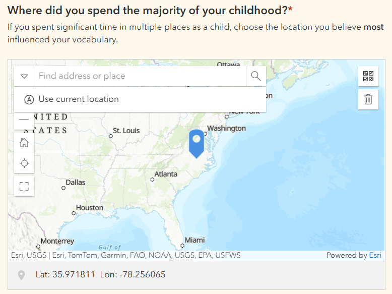 To address the necessary spatial component of the survey, two questions were added prompting the user to add a point indicating the location where most of their childhood as well as where most of their adulthood was spent. Anticipating that generational differences may play an important role in vocabulary, the survey begins with a question asking respondents for their year of birth; the response to this question determines whether both the childhood and adult location questions are presented. Keeping in mind that some respondents may not use a phrase like this, subsequent questions are only presented if the respondent claims to use a phrase like this based on the provided definition, including a checklist question of all phrases used and a single choice question to indicate the user’s most used phrase. To provide additional spatial context if available, if the respondent is certain of where or from whom they picked up a variation, for example, from visits to a grandparent in Ohio, they can provide this information in subsequent optional questions.