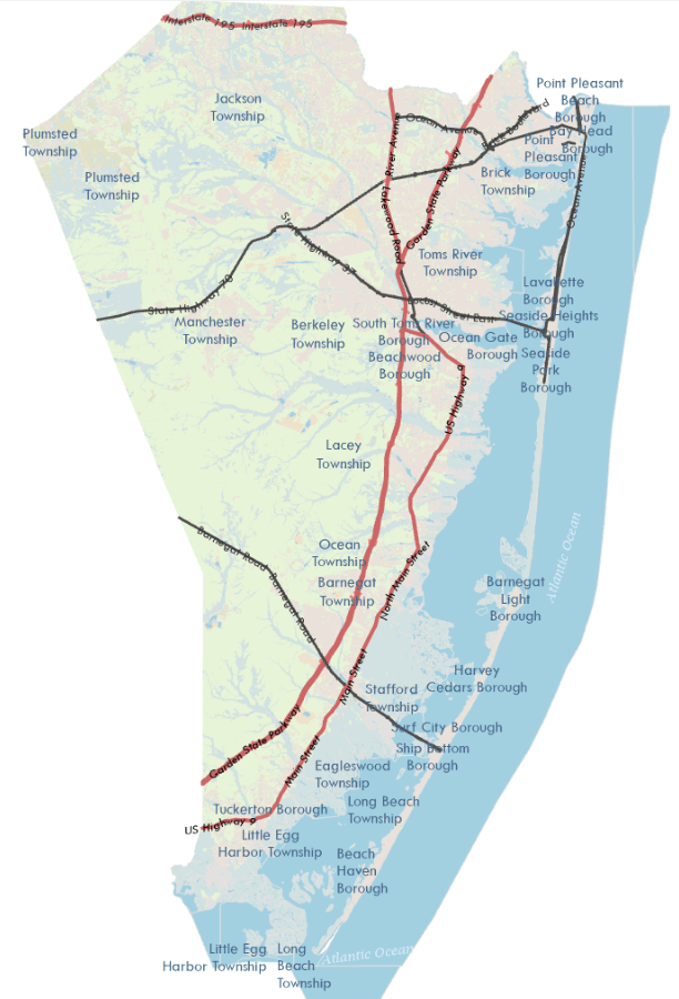 The selection of an appealing and informative basemap can enhance or detract from the best GIS products. The goal of this project was to design a customized basemap for a small regional area, providing the necessary information to contextualize features highlighted in the area. The extent selected for my basemap was Ocean County, New Jersey, a coastal county containing several barrier islands as well as major highways. The secondary goal of this project was to maintain clarity and relevance by differently symbolizing features across multiple zoom levels.